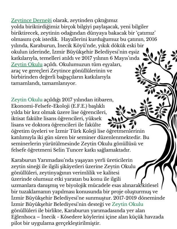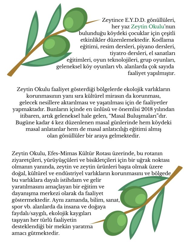 Zeytin Okulu’nun faaliyetleri iki ana çalışma alanımız çerçevesinde üç başlıkta aşağıdaki gibi özetlenebilir: